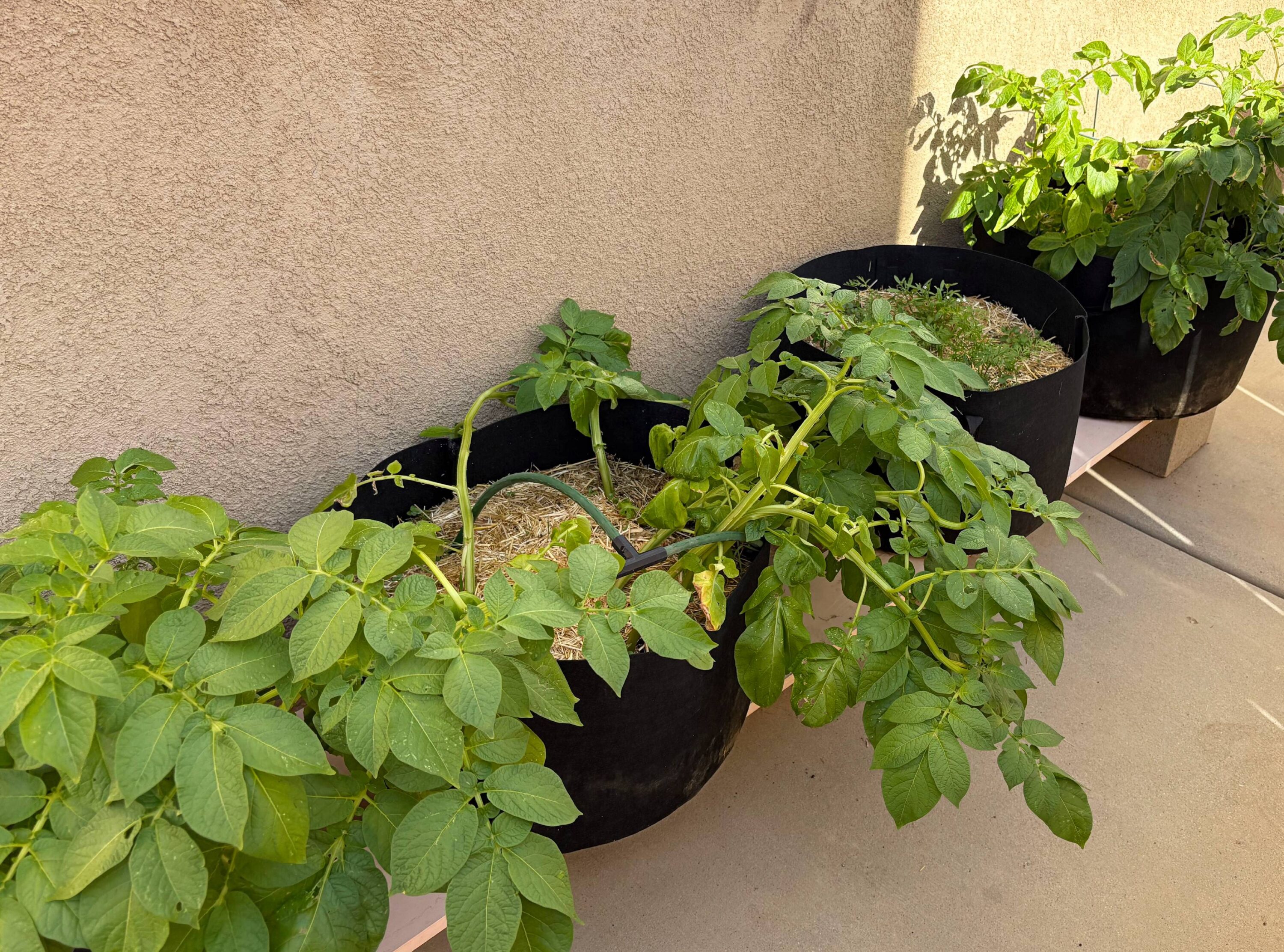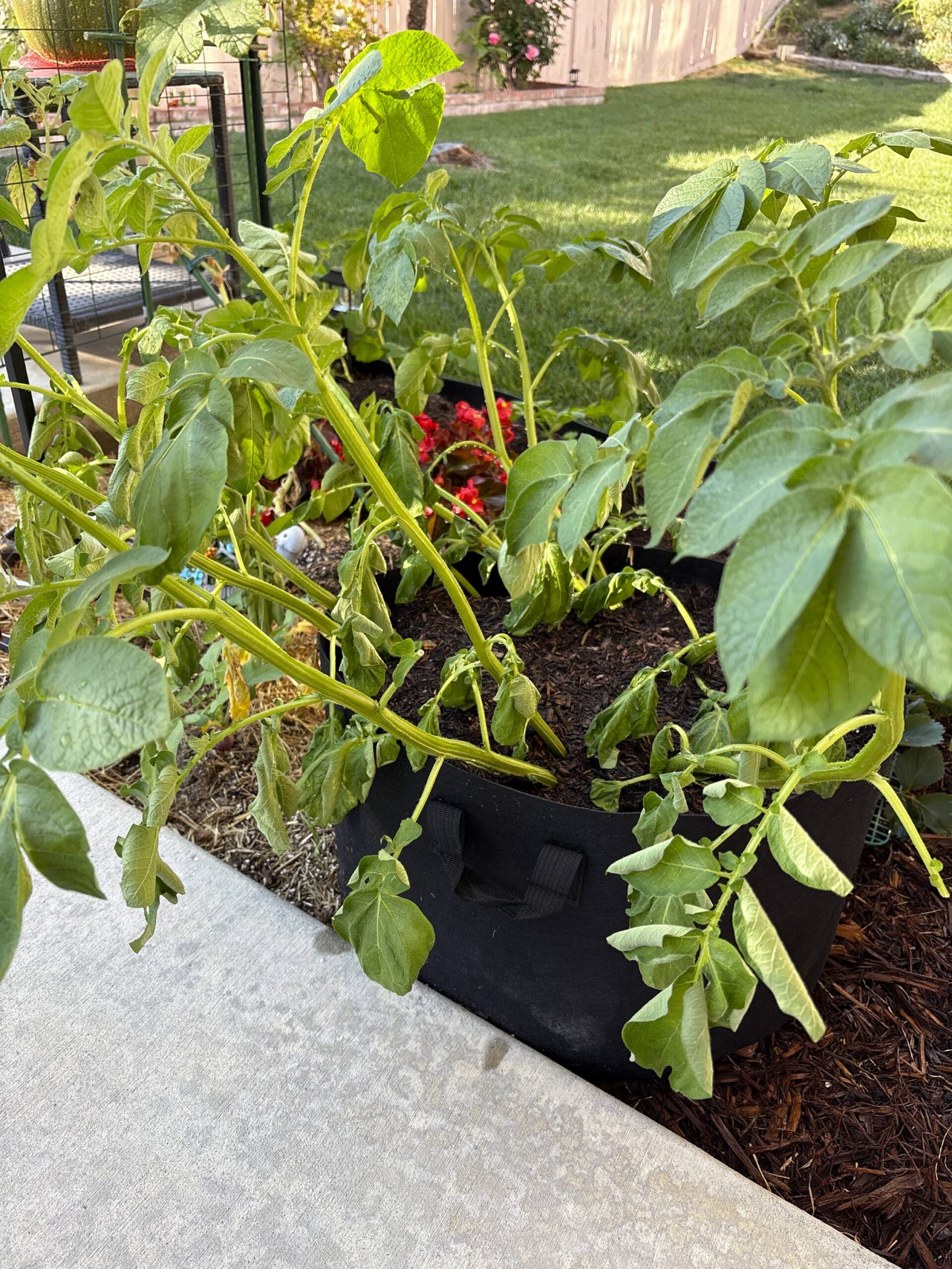 Looking back, I mixed some Trifecta+ into the grow bags and in-ground planting holes when first planted, and this week I hit them all lightly with Alaska Fish Fertilizer and sprinkled a bit more Trifecta+. All the potatoes are mulched with straw, after a layer of Black Kow when planted.