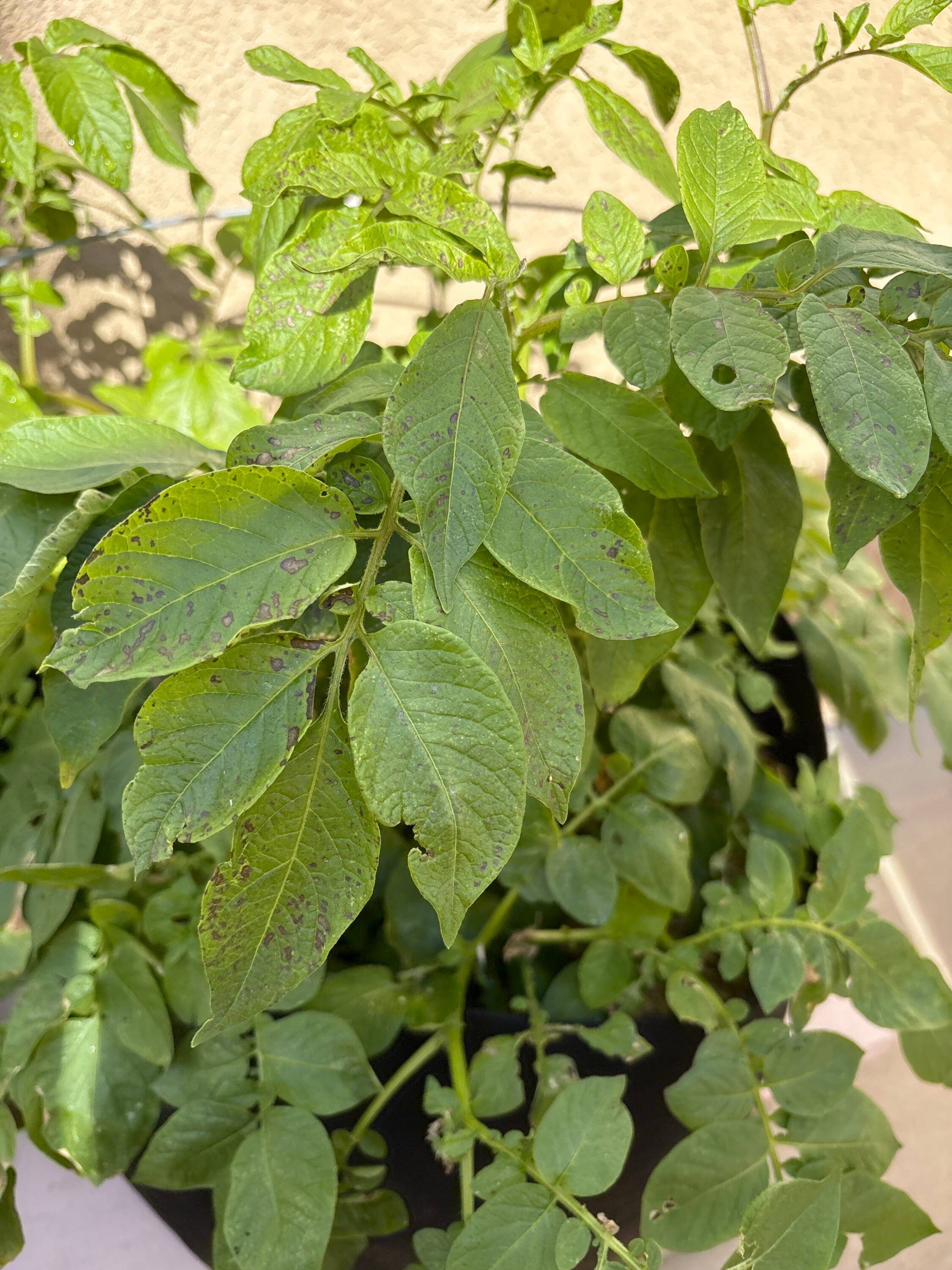 One potato plant on the hill looks excellent. The others look a bit stunted. The potatoes in grow bags are the roughest: rust spots, droopy stems, unhappy leaves. Watering has been consistent. They were planted around September 15, and now it’s December 5, so the 90-120 day harvest window is coming up. But this isn’t the kind of die-back I’ve seen in photos or videos of people harvesting.