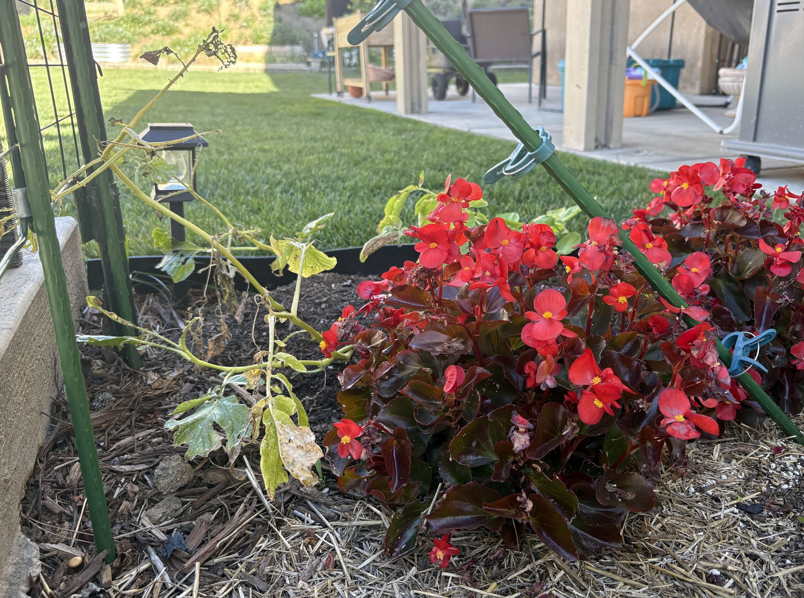 The beans in the strawberry patch have wide spacing between leaf nodes and very little foliage for plants that have been growing for about two months. I pruned off several of the oldest lower leaves that showed rust-like damage, which I suspect might be mites. I scheduled a three-round insecticidal soap treatment for the beans and potatoes, spaced four days apart, starting tomorrow.